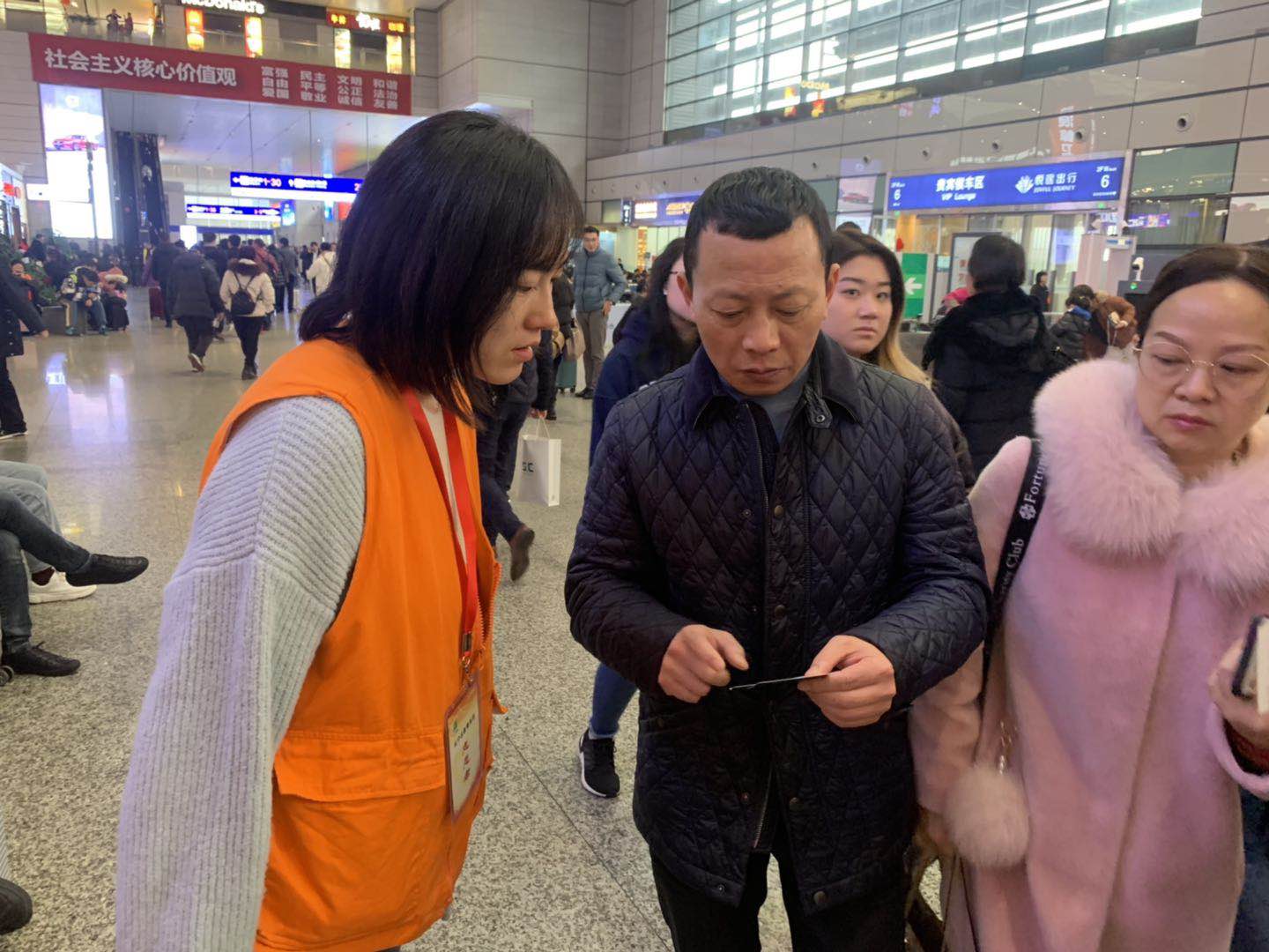 1月10日中午,志愿者准时到达集合点。今天是上海春运开始的第一天,火车站大厅人头攒动,好不热闹。人们踏着匆匆的步伐准备踏上回家的团圆旅途。“姑娘,我这个检票口怎么走?”“你好,我这个学生票怎么兑换?”“请问我用临时身份证该怎么取票。”……面对这一个个问题,我们的志愿者老师每次都会面带微笑,用最温暖的语气为乘客们做出最准确的引导,帮助乘客解决问题。过程中,我们的领队教工团书记童老师每隔一段时间会往返于两个志愿工作点之间,了解我们在服务过程中碰到的问题,并通过实地考察的形式去解决这些问题,并反馈给我们,以帮助我们更好地服务乘客。
