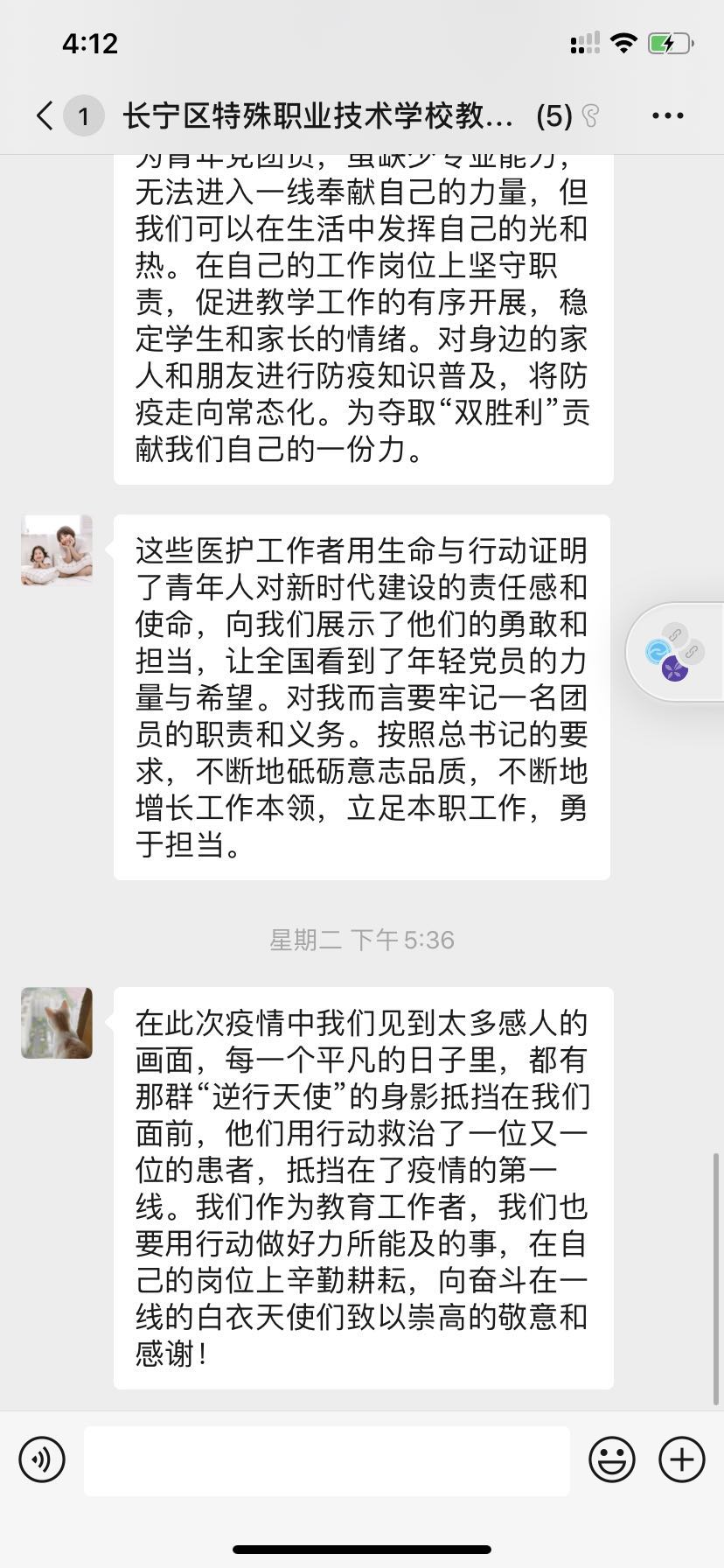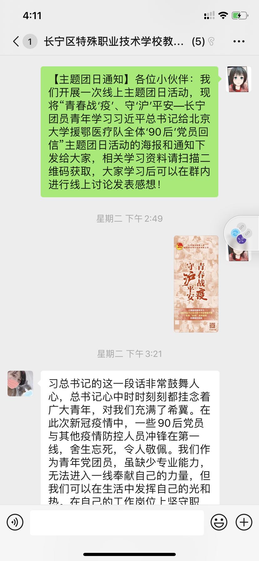 朱老师表示习总书记的这一段话非常鼓舞人心,总书记心中时时刻刻都挂念着广大青年,对我们充满了希冀。在此次新冠疫情中,一些90后党员与其他疫情防控人员冲锋在第一线,舍生忘死,令人敬佩。我们作为青年党团员,虽缺少专业能力,无法进入一线奉献自己的力量,但我们可以在生活中发挥自己的光和热。在自己的工作岗位上坚守职责,促进教学工作的有序开展,稳定学生和家长的情绪。对身边的家人和朋友进行防疫知识普及,将防疫走向常态化。为夺取“双胜利”贡献我们自己的一份力。